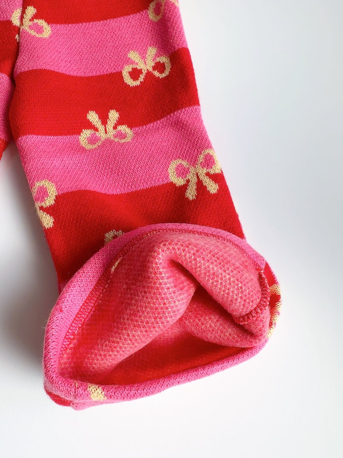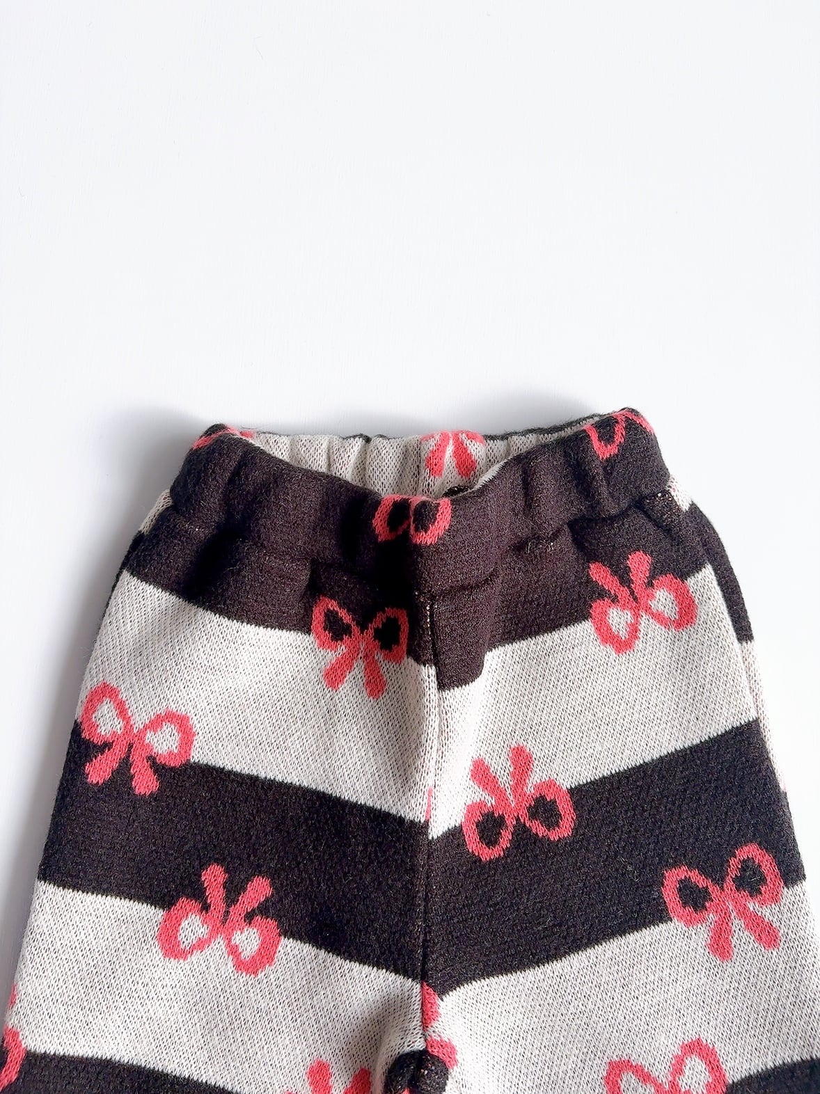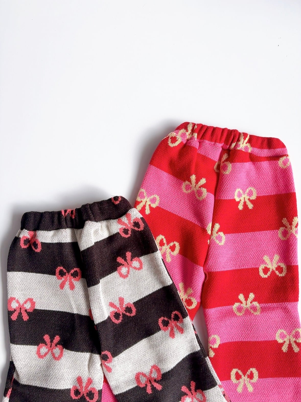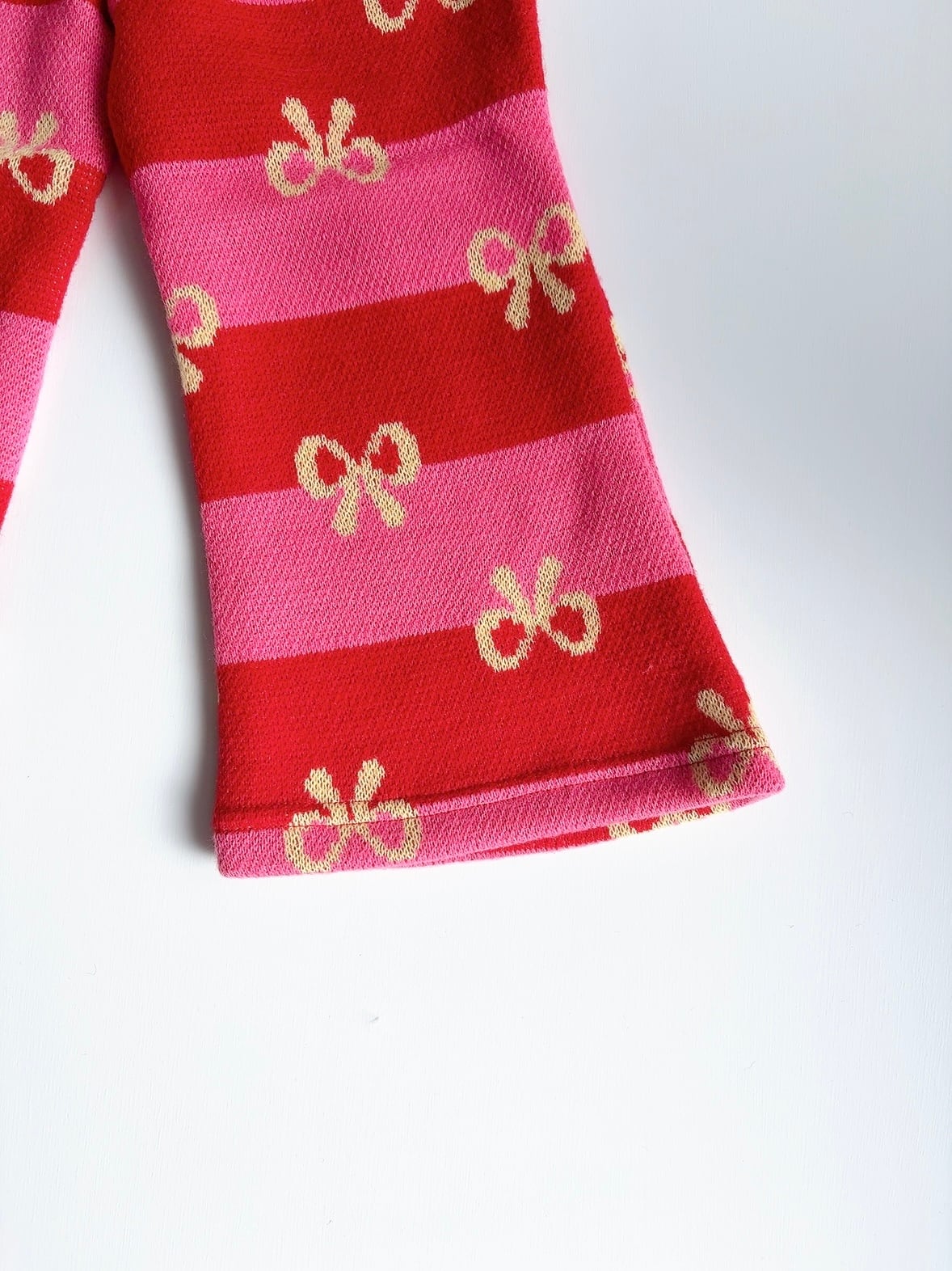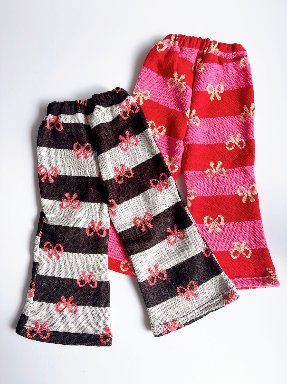 ピンク×赤と黒×白のボーダーに、ちょこんと並んだリボン柄がとびきりキュート!裾広がりのフレアシルエットで、動くたびにふわっと揺れて写真映えも◎。おしゃれキッズの冬コーデにぴったりな1枚です。